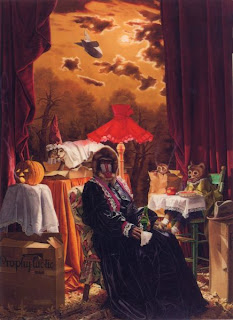 Roller actually paints "from life", using various props that he arranges like a retail store window display. He assembles these scenarios in his studio, and then trains a single light on the arrangement, giving it the dramatic shadowy look that it has (much like a Caravaggio painting), where it literally reminds you of a scene in a dimly lit stage play (Roller even adds curtains to many of his arrangements). As far as the actual painting technique goes, he literally follows in the traditions of the Old Masters. He paints on high quality hand-woven linen canvas, which is itself gessoed several times, sanded between applications, and then primed with three coats of white lead paint, which according to his website, takes one month's drying time between the applications. Being the type of person that I am, I would have a VERY hard time being patient enough to see a process like this through to completion. Once he takes care of the gessoing and priming of the canvas, he then creates an underpainting with oil paint thinned out with turpentine. It is from the basis of this underpainting that he gets a feel of the balance of light and shadow, as well as mass, for all of the different elements of his painting. The drying time for the underpainting phase is yet another month, and then he gets down to business, filling in the painting with oil paint, and then glazing it with transparent colors, which creates a depth and richness to the coloration of the painting. After this, he finally tops it off with a varnish to seal the painting and protect it.